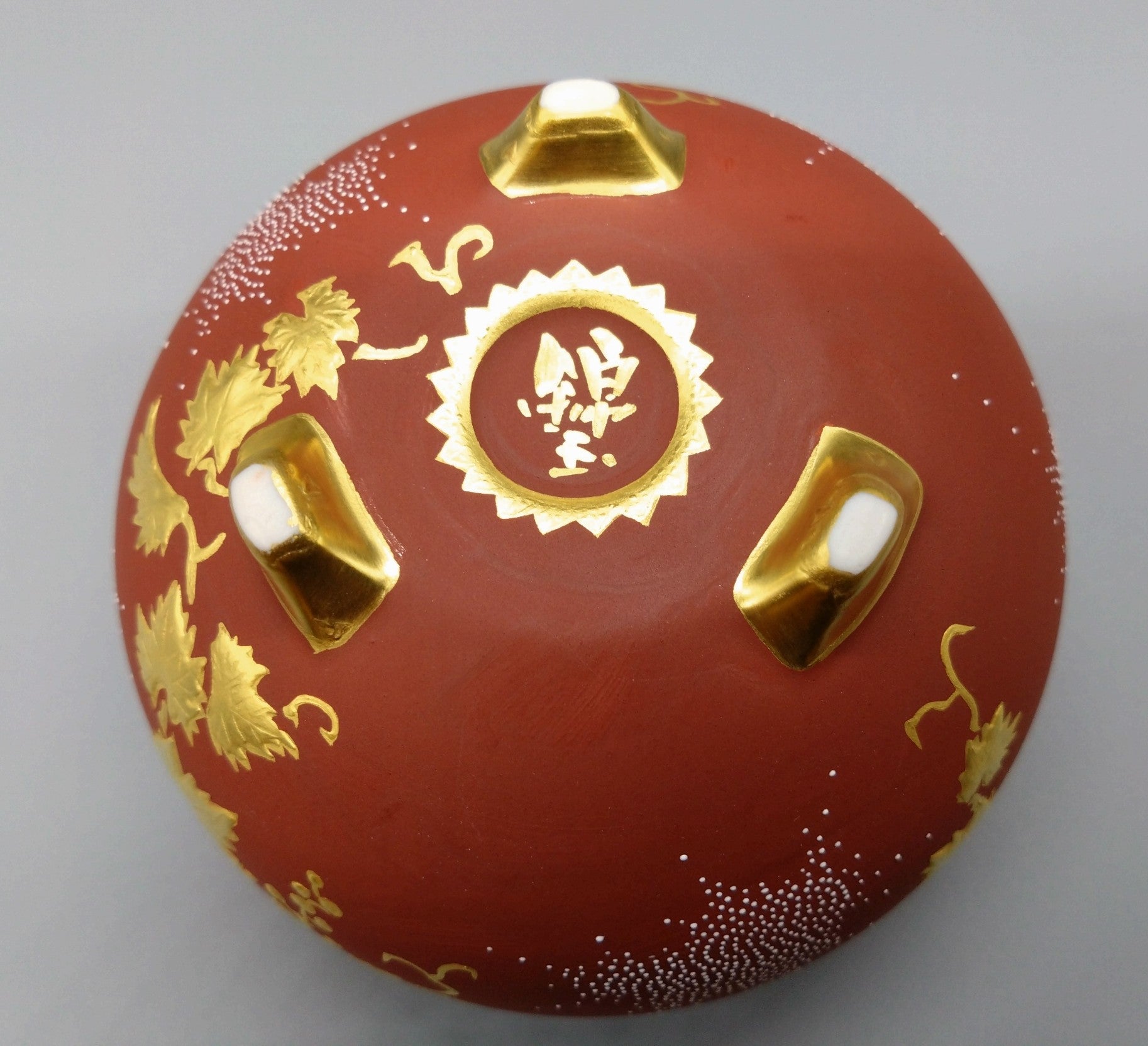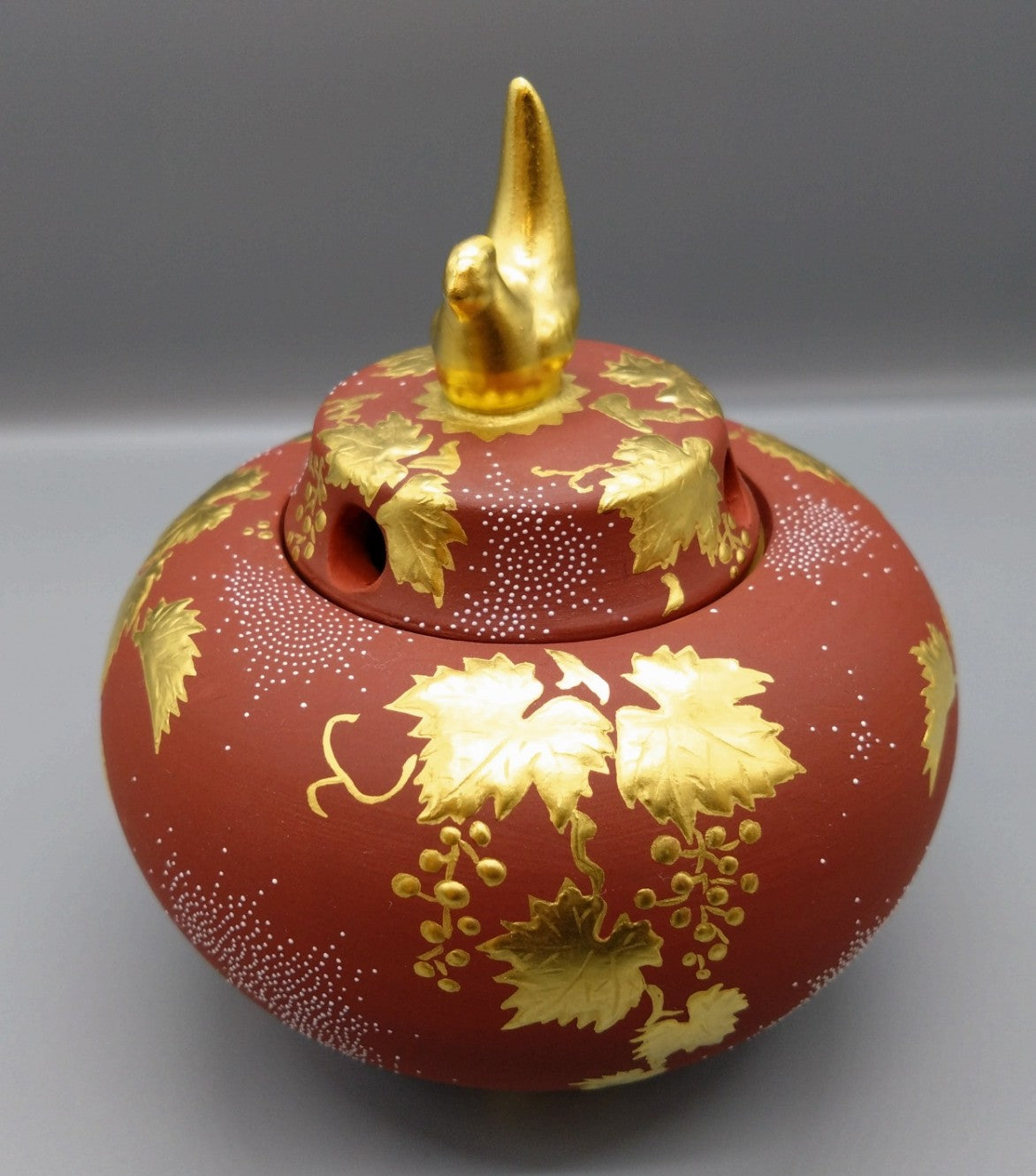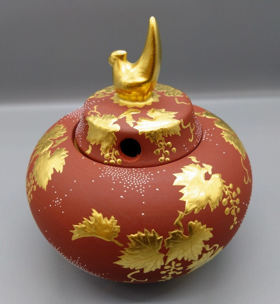 九谷焼 仲田錦玉 盛金白粒ぶどう3.8号香炉(朱地)