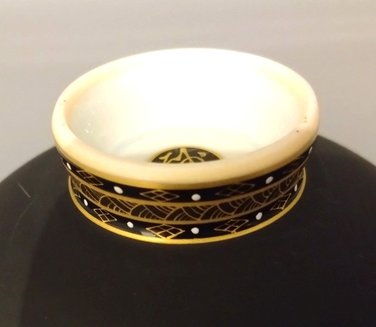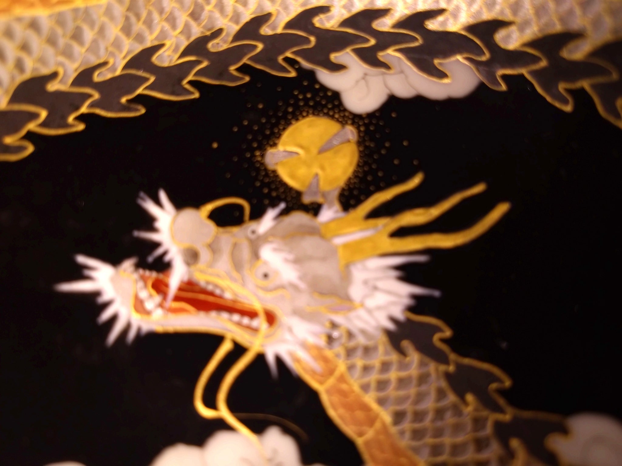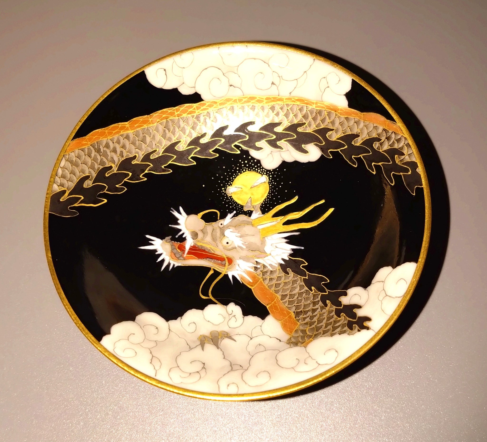 新川砂山氏の作品に施される金は全て本金が用いられ、本作も龍の身体や盃の縁等、華やかながら、落ち着きのある雰囲気を演出しています。
