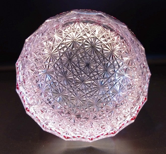 菊繋ぎの精緻なカットと、極限まで薄く残した色ガラスが光を受けて、気品のある輝きを放ちます。