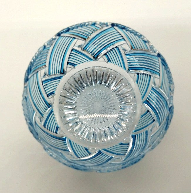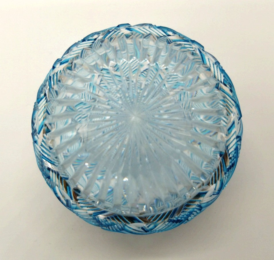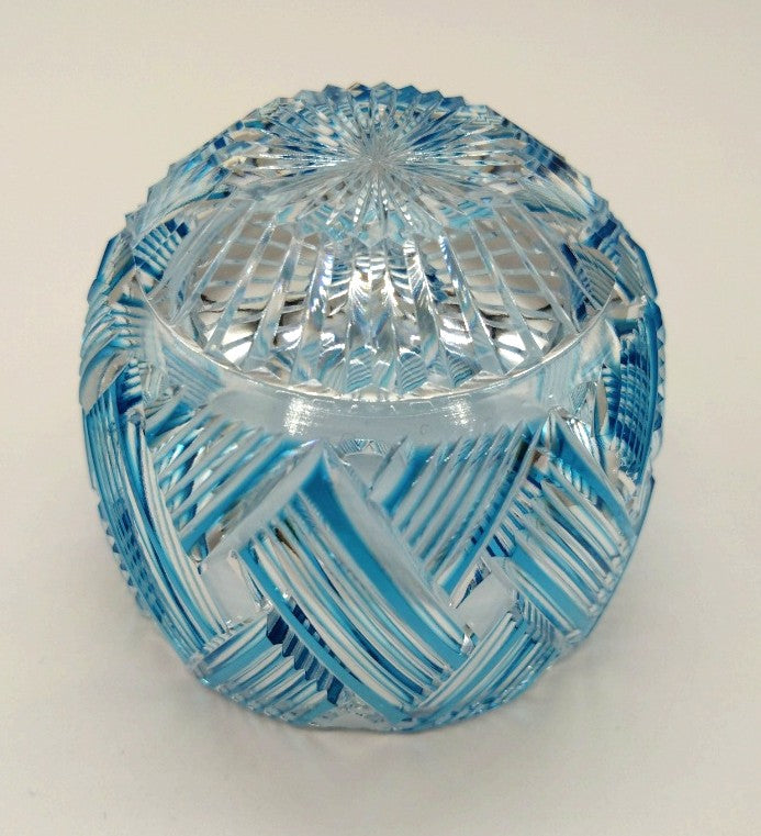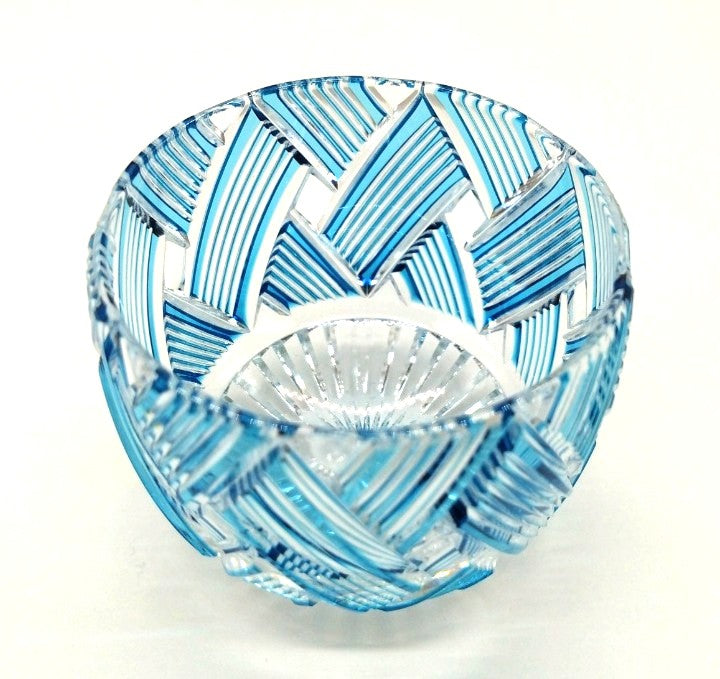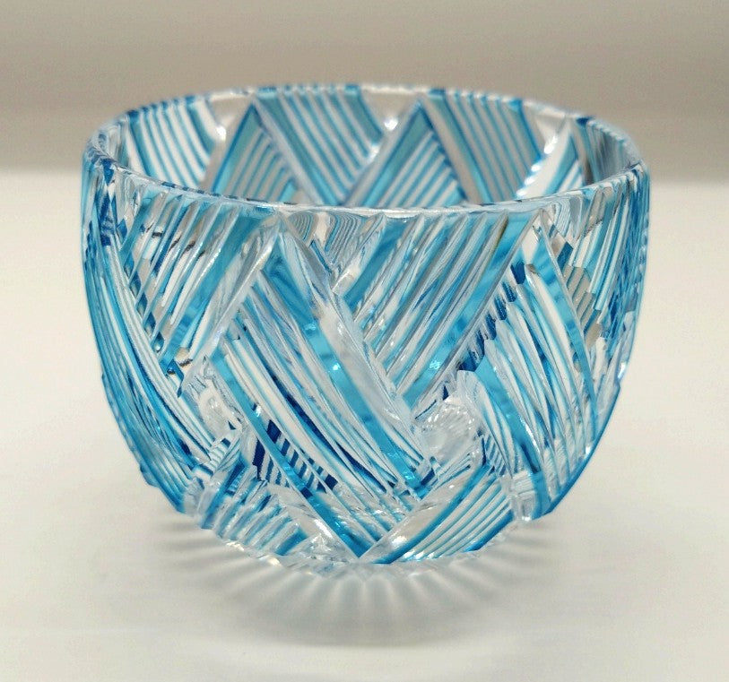 涼やかなブルー色のガラスは、清らかな水面を思わせる透明感のある色合い。透き通る青の色彩が、繊細なカットの美しさを一層引き立てます。