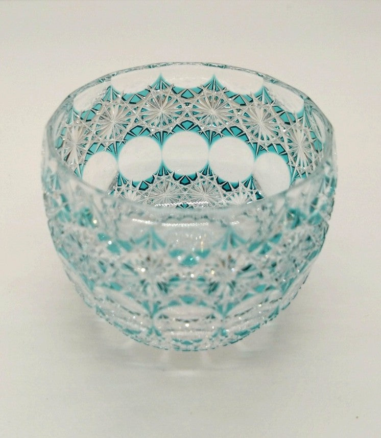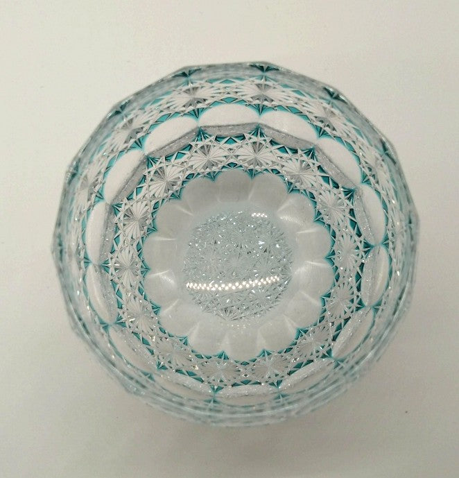 菊繋ぎの精緻なカットと、極限まで薄く残したグリーンのガラスと透明なクリスタルガラスが光を受けて、気品のある輝きを放ちます。