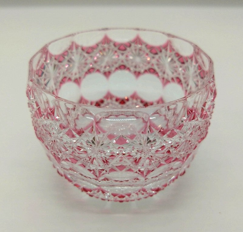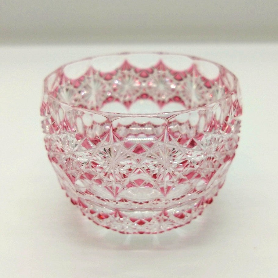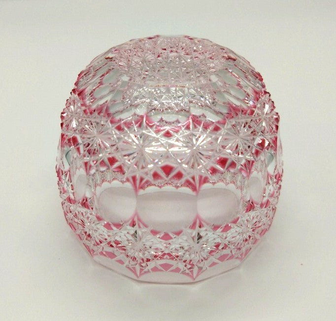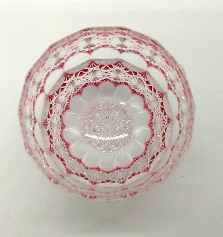 菊繋ぎの精緻なカットと、極限まで薄く残したピンク色のガラスと透明なクリスタルガラスが光を受けて、気品のある輝きを放ちます。