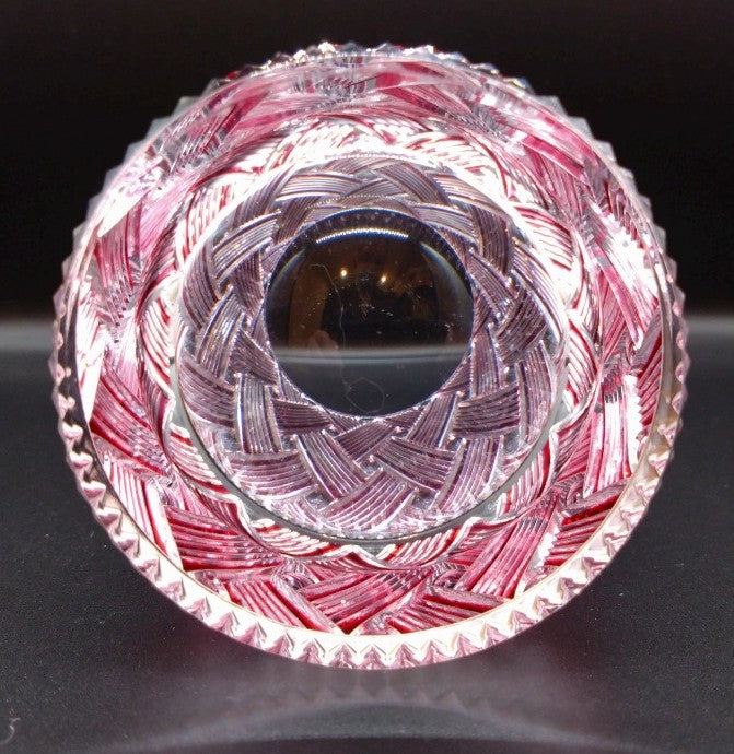 一本一本の線が、まるで細い糸を紡ぐように彫り込まれたカット、その緻密な直線が編み込まれるように施された意匠が、グラスに繊細さと躍動感を与えています。